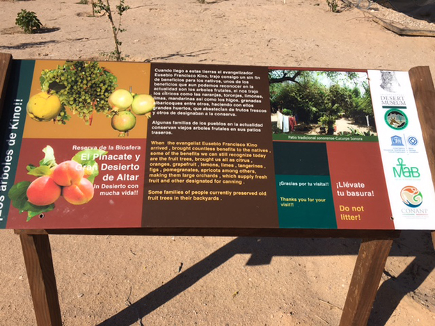 As a result of the project, the first Ethnobotanical Garden was established at the Research Station facilities in the Biosphere Reserve El Pinacate. Park staff made several trips to Magdalena de Kino and San Ignacio, Sonora to collect seedlings for the garden. Heritage fruit trees, quinces, pomegranates, peaches, figs, apricots, and other species were planted. The new garden is part of an educational tour that promotes the value and history of ethnobotanical gardens and the contribution of Padre Kino to native cultures.