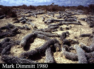 Magdalena — Located in coastal Baja California south of the Vizcaino, it is similar in appearance to the Vizcaino but the species are somewhat different. Most of its meager rainfall comes in summer and the aridity is modified by Pacific breezes. The bleak coastal Magdalena Plain's only conspicuous plant is the weird creeping devil cactus (Stenocereus eruca), but inland the rocky slopes are rich and dense with trees, succulent shrubs, and cacti.