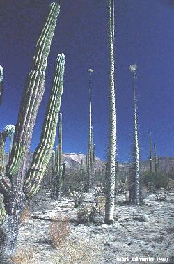 One distinguishing characteristic of deserts is extreme contrasts. For example, the stark contrast between sun and shadow is dramatically different from the softer light of humid lands, and has inspired many artists in various media, including some exultant prose. Weather swings between extremes too, and the great variation in rainfall from year to year has a dramatic effect on the flora and fauna. It seems contradictory that a landscape that is most famous for its parched and barren character could also be famous for spectacular displays of wildflowers. Yet it's true. In fact the most extensive carpets of wildflowers in the North American deserts occur in their most arid parts - such places as Death Valley, Anza-Borrego, the Gulf coast of northern Baja California, and the Gran Desierto-Pinacate region.