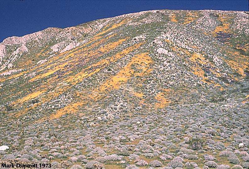 Even in dry years some places may get lucky. In 1974 the Coachella Valley (e.g., Palm Springs) received just enough rain to grow some flowers on the dunes. The dark green mounds are Russian thistle (tumbleweed), a pernicious exotic weed that in wetter years can smother native wildflowers.