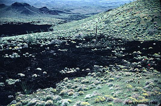 In 1991 the Pinacate received just the right amount and timing of rain to sprout skeleton weeds (Eriogonum spp.). These plants are only a few inches tall and grew only where a layer of volcanic cinders mulched the fine silty soil below.