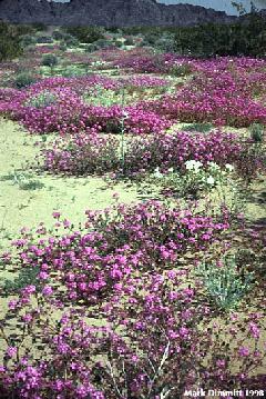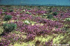 El Gran Desierto east of San Luis RC, Sonora. Huge areas of this sand sea were carpeted with Abronia villosa (sand verbena) from November 1997 through March 1998. This photo was taken in March after half the sand verbena had dried out! In February the purple carpet was interrupted by the white of Oenothera deltoides (dune evening primrose) and Hesperocallis undulata (desert lily), and the yellow of Baileya pauciradiata (a desert marigold relative).