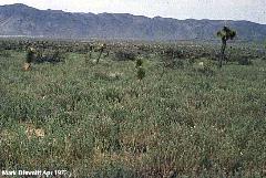 Above right: 1998, another wet year, but instead of native wildflowers this area has been taken over by a pernicious exotic weed, Sahara mustard (Brassica tournefortii). (Some nearby areas had good flowers.) First discovered in the United States only in the 1930s, it has by now invaded most of the dry sandy areas of the Sonoran Desert, often to the nearly complete exclusion of native annuals. Such invasive alien species cause immeasurable damage to natural habitats.