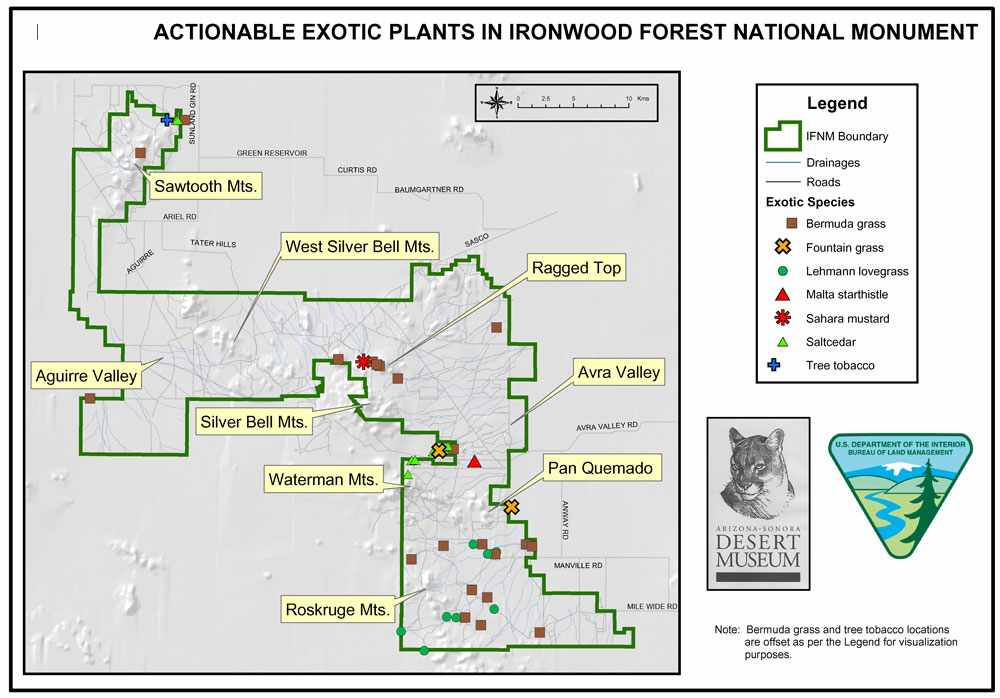 The 54 exotic plants constitute 9.6% of the IFNM flora. This compares favorably with the Tucson Mountains flora, 13% of which is exotic (Rondeau et al. 1996). The smaller percentage of exotics probably reflects the lesser degree of human disturbance in Ironwood Forest National Monument. However, there are several exotic species of major concern because of their potential to displace native plants and drastically disrupt community integrity.